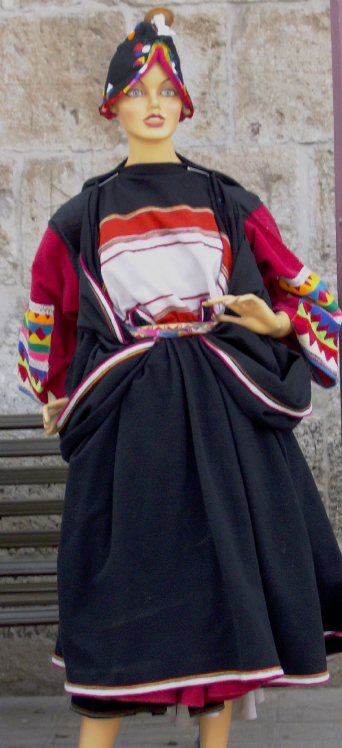 Finalmente llevan en la cabeza una montera negra adornada con figuras geométricas multicolores y sobre ella, bien sujeta la "Pusca", intrumento para hilar, dado que sus festividades están muy ligadas a sus actividades diarias, calzan hojotas.