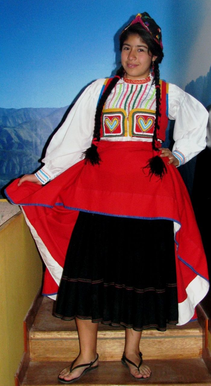 Visten una pollera negra, sobre ella llevan una pollera de color rojo, ambas sujetas por una faja tejida, angosta y multicolor terminadas en borlas que dan colorido al atuendo. La pollera roja se recoge delante de tal manera que puede verse la pollera negra interior, generándose un hermoso contraste.