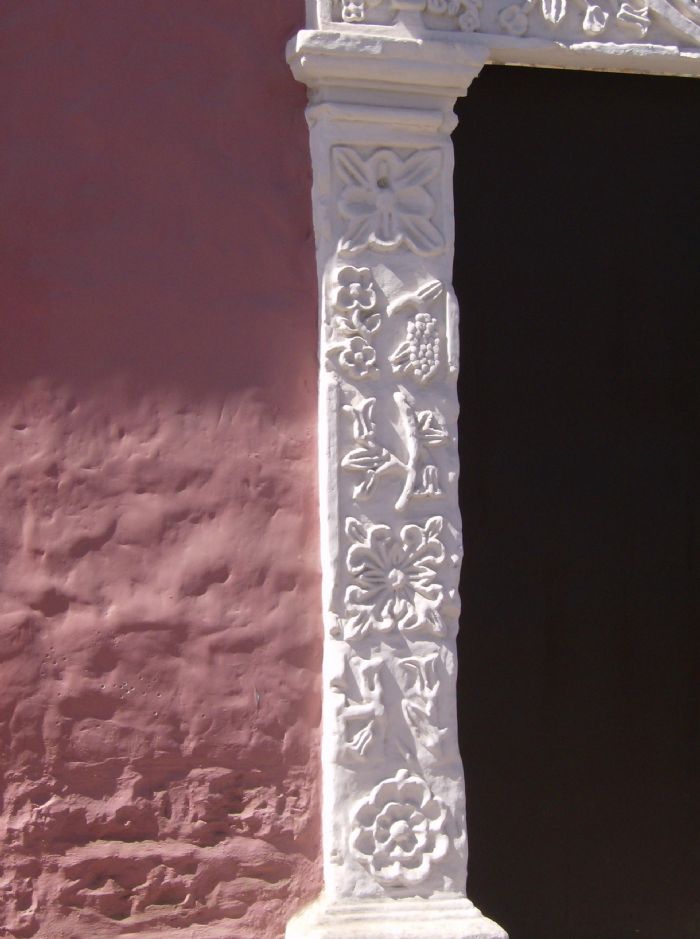 Las dos pilastras que posee esta portada, tienen bases de piedra labrada, con fustes rectos de forma ortogonal de forma continua, unidas con mortero de cal proyectado al final por un capitel muy simple. Encima de estas se ve un entablamiento partido muy bien labrado, a los extremos vemos dos capiteles proyectados al mismo eje de sus fustes. Rematando este conjunto una moldura labrada.