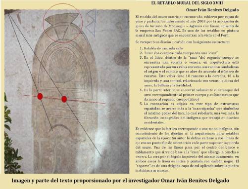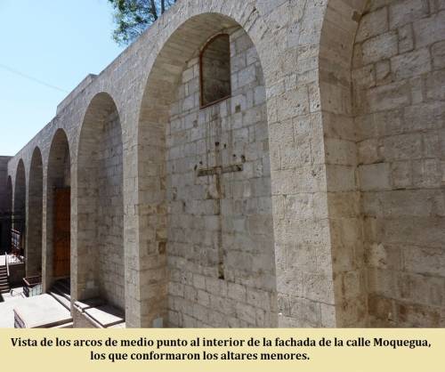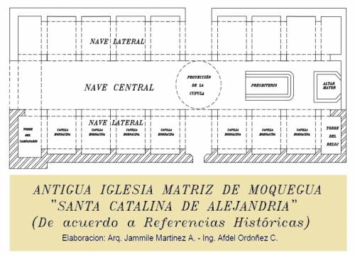 El impresionante Muro que hoy conocemos, de lo que fuera la Iglesia Matriz de Moquegua, ubicada en plena Plaza de Armas, no fue siempre así, tampoco estuvo ubicada exactamente en el mismo sitio, hasta finales del siglo XVI, los escritos mencionan que “.. lindaba por arriba con Juan de Ochoa, al lado con plazuela y casa del Vicario, calle del Medio y por otro lado con almenas del dicho cementerio…”(G.Viñuales y R.Gutiérrez 1977), los datos mencionan que el nuevo sitio era vecino del anterior. La edificación de Santa Catalina de Alejandría estaba hecha con muros de adobe, la cubierta de madera armada a par y nudillo, similar a los techos de dos aguas, (o con artesón) al modo Mudejar (estilo hispanomusulmán) y sobreprotegido con tejas. En cuanto a su antigüedad, podemos mencionar que de acuerdo al documento que se encuentra en el Archivo Arzobispal de Arequipa, con fecha 1616, se menciona; “… para que poblase una villa, vuestra alteza mando que la iglesia que estaba de más de cincuenta años en esta parte de la otra banda del río….”, refiriéndose a la antigua Iglesia de Santa Catalina de Alejandría. Del mismo modo, se sabe que en 1590 existieron tres cofradías; la del Santísimo Sacramento, Purísima Concepción y Animas, que seguramente tenían sus altares; siendo repositorio de otras imágenes con advocación, como San Bernabé cuya procesión terminaba en la Ermita que se encontraba en la colina del mismo nombre, culto que continuó hasta la primera década del siglo XIX.
