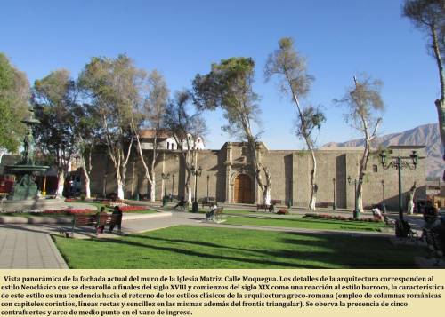 La Iglesia pasa a ser La Matriz, cuando el pueblo de Moquegua fue elevado a la categoría de Villa, el año de 1625. Un dato que vale resaltar es la existencia de un pasaje en el siglo XVI cuyo ingreso, probablemente, fue por el portón que se encuentra al final del Muro lateral de la Matriz, calle Tacna, antes conocida como La Soledad y terminaba en la actual calle Ancash (Víctor Casanova Vélez 2020).