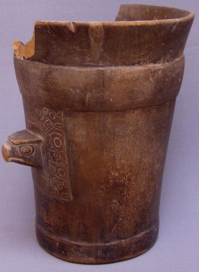 Kero Ceremonial con decoración tallada de un ave rapaz, sitio Omo